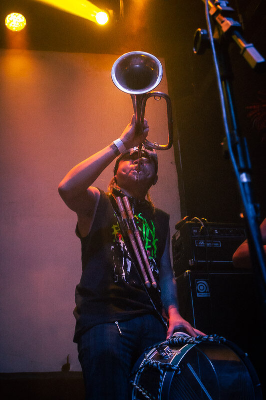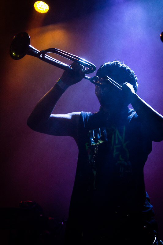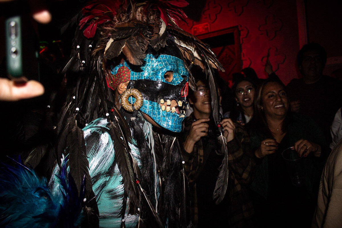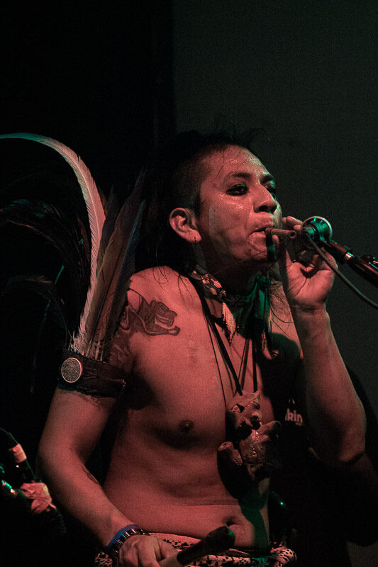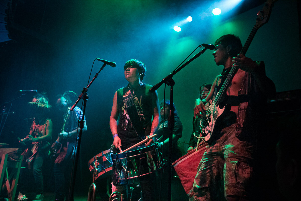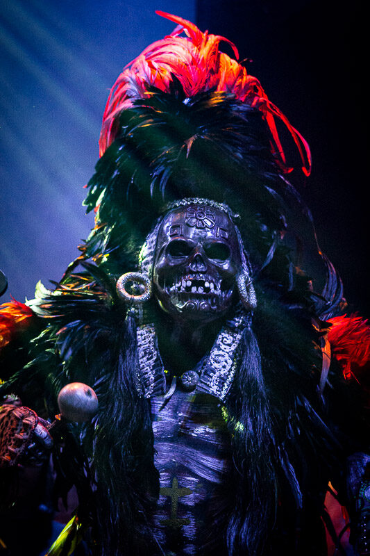 Uno de los momentos cumbre de la noche llegó cuando subieron al escenario los pupilos de Los Cogelones con sus instrumentos de banda de guerra y comenzaron los primeros acordes de “Mexica”. La gente explotó en éxtasis cuando dos guerreros mexicas se hicieron presentes en el escenario y al poco tiempo bajaron hacia el público para formar parte del baile errático que se estaba formando en el corazón de la pista. Los ocho minutos de duración de este sencillo fueron insuficientes para lo que estaba sucediendo en la pista, todos olvidamos nuestras diferencias por un momento y formamos parte de un ente que bailaba sin preocupaciones al ritmo de las trompetas militares.