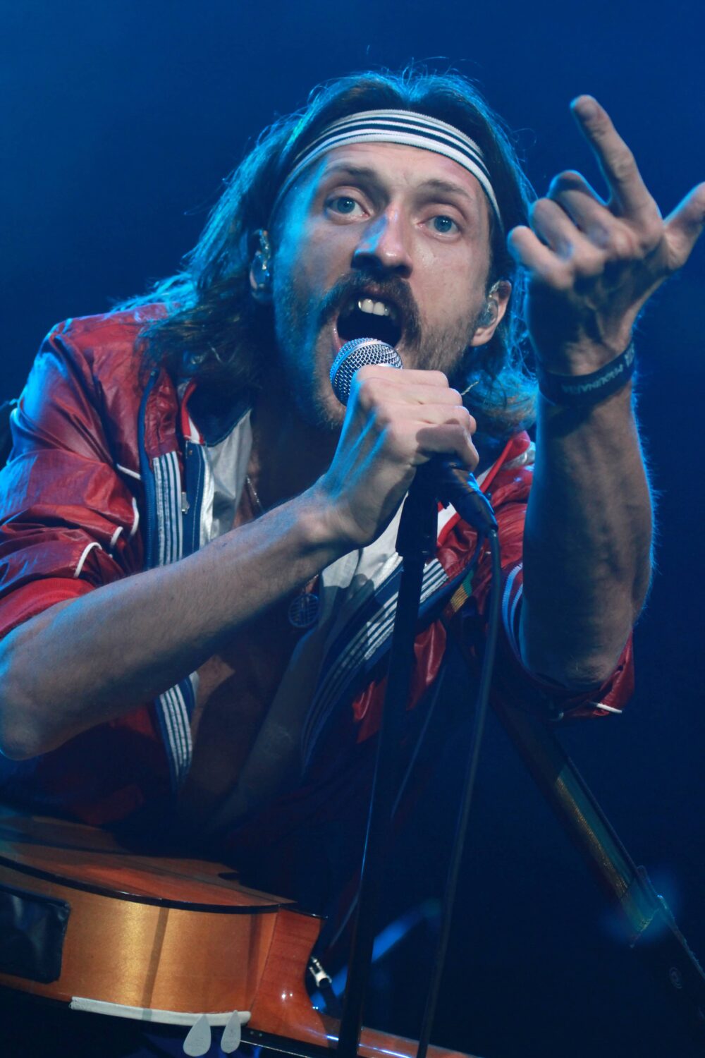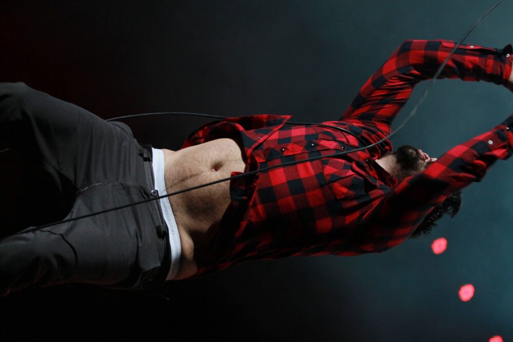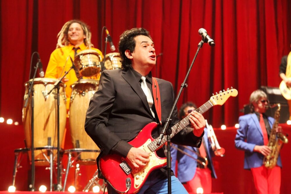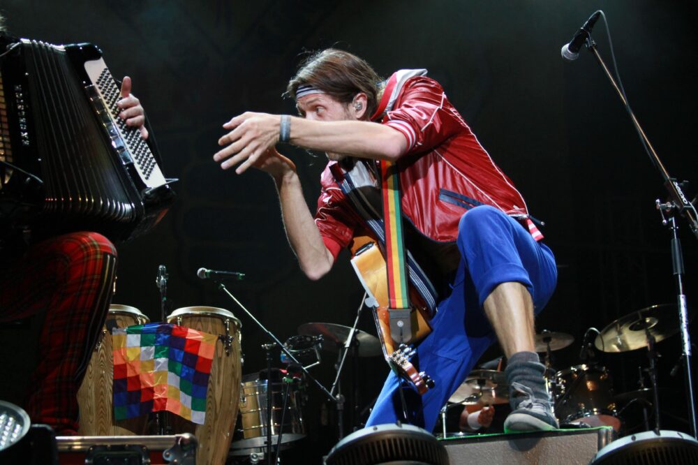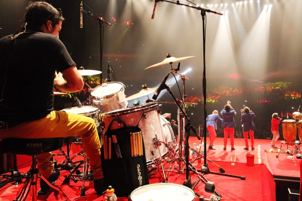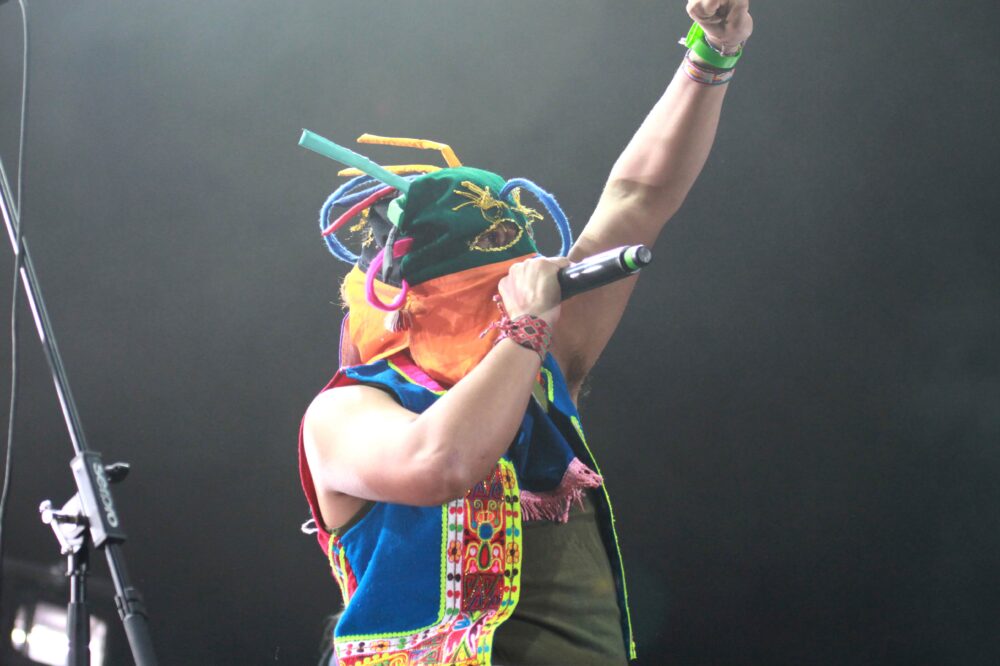 Luego del cambio de instrumentos, verificar los últimos detalles en las pruebas de sonido así como en la iluminación, las luces se apagaron y los acordes de "La Guitarra" hicieron que el coloso se transformara en un carnaval. Ahí estaban Los Auténticos Decadentes brincando en el escenario enfundados en prendas de distintos colores.